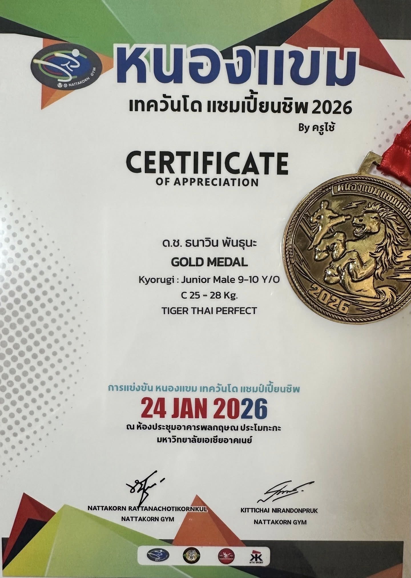 ได้รับรางวัล เหรียญทอง ประเภทต่อสู้ รุ่น 9-10 ปี