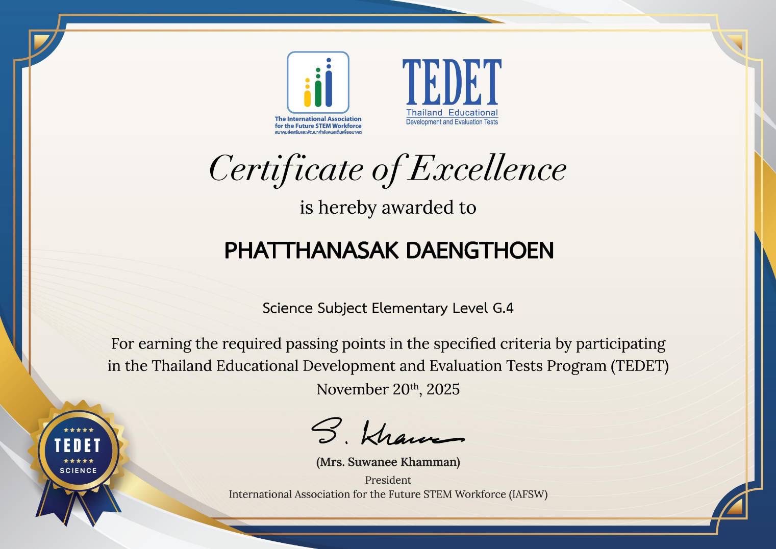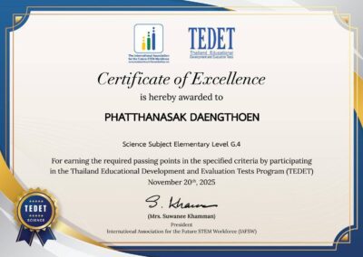 และได้เข้าร่วมโครงการประเมินและพัฒนาสู่ความเป็นเลิศทางคณิตศาสตร์และวิทยาศาสตร์ ประจำปี 2568 ปีที่ 16 สอบแข่งขันในรายวิชาวิทยาศาสตร์