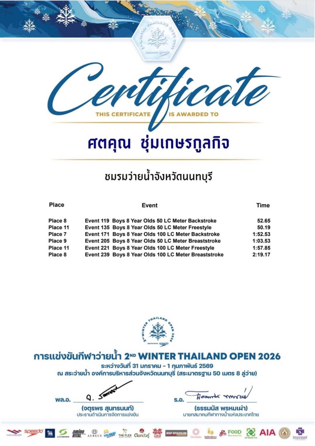 เข้าร่วมแข่งขัน 2ND WINTER THAILAND OPEN 2026 และได้รับรางวัล ดังนี้