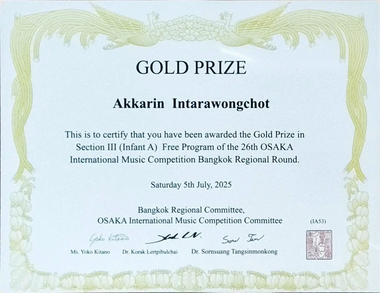 Section III (Infant A) Free Program of the 26th OSAKA International Music Competition Bangkok Regional Round.