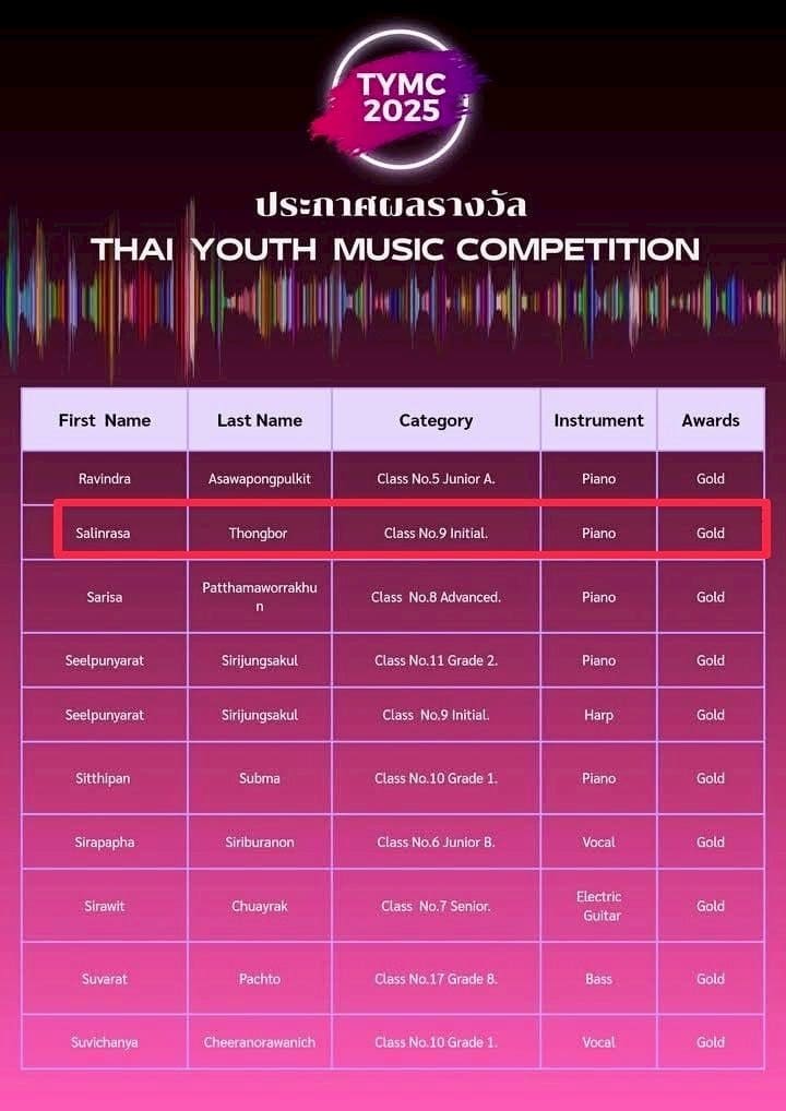 จากการแข่งขันดนตรี รายการ Thai Youth Music Competition 2025 ประเภท Piano รุ่น Initial